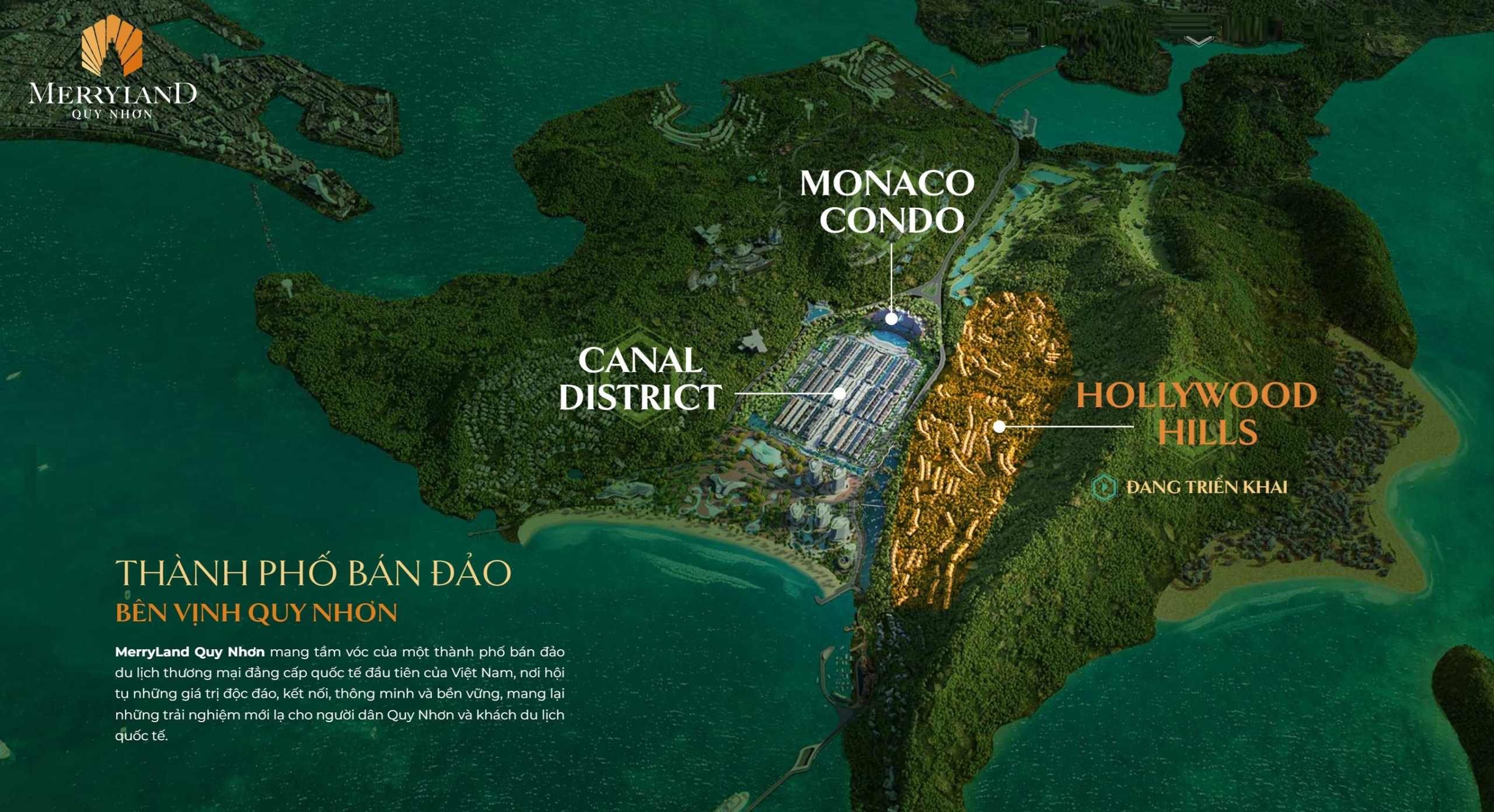 Bộ sưu tập tuyệt phẩm biệt thự bán đảo Hollywood Hills, trải rộng 90ha trên dải đồi ôm trọn vịnh biển và thung lũng thoai thoải nơi bán đảo Hải Giang độc nhất vô nhị. Đây là một trong những phân khu đắt giá nhất tại MerryLand Quy Nhơn góp phần định hình trải nghiệm du lịch mới, đưa Quy Nhơn – Bình Định trở thành điểm đến hàng đầu châu Á.