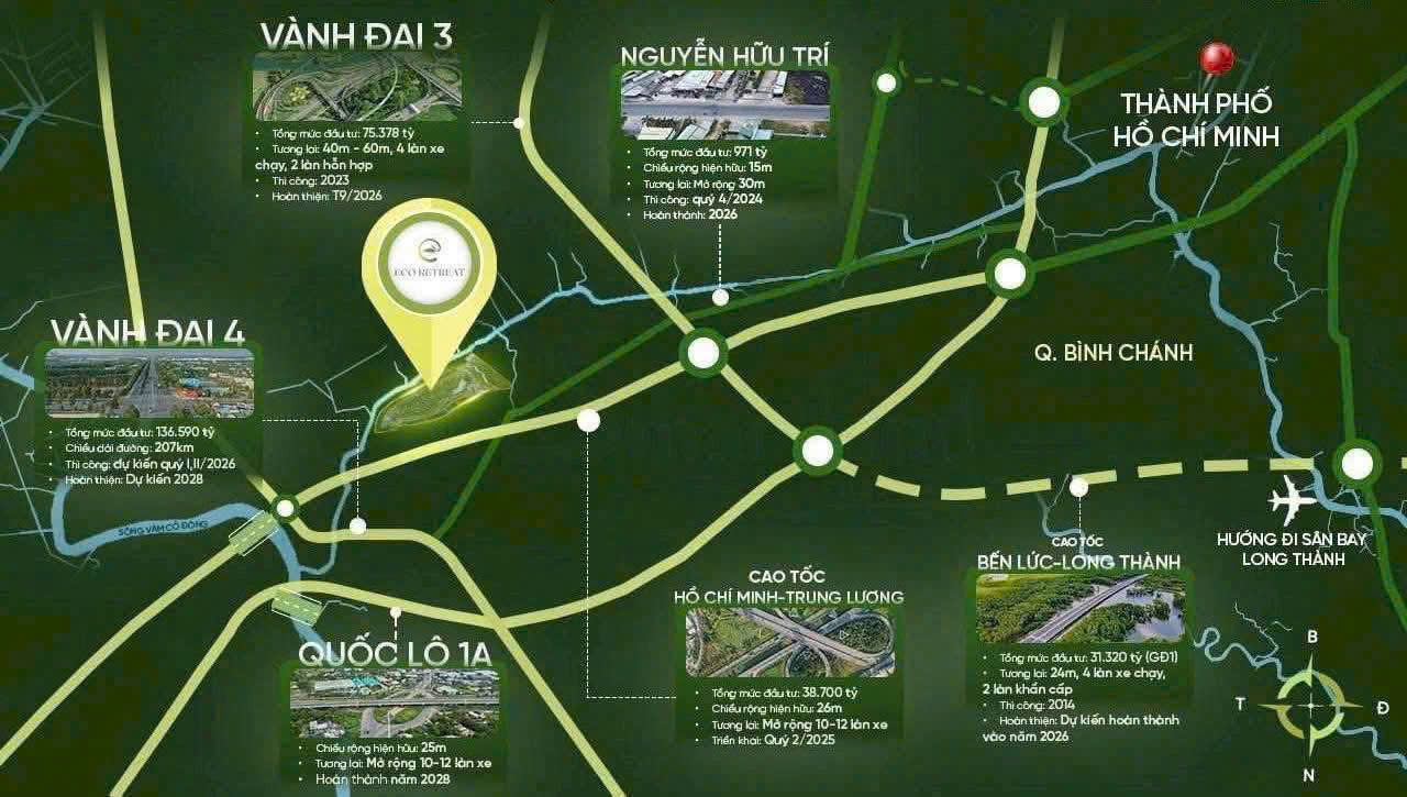 Eco Retreat sở hữu vị trí chiến lược tại Long An, chỉ mất 30-40 phút di chuyển từ trung tâm TP.HCM qua trục Nguyễn Văn Linh – Quốc lộ 1 – cao tốc Bến Lức – Long Thành. Đây là điểm giao thoa giữa đô thị hiện đại và thiên nhiên yên bình.